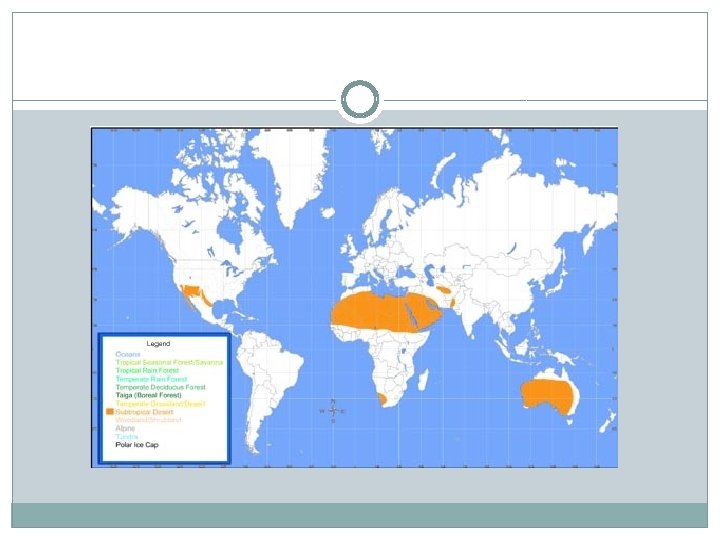 DESERT �Distribution: occur in bands near 30° N & S latitude or in interior of continents �Precipitation: low & variable; <30 cm/yr �Temperature : variable seasonally & daily hot desert: max T may > 50°C dry desert: low T may < -30°C