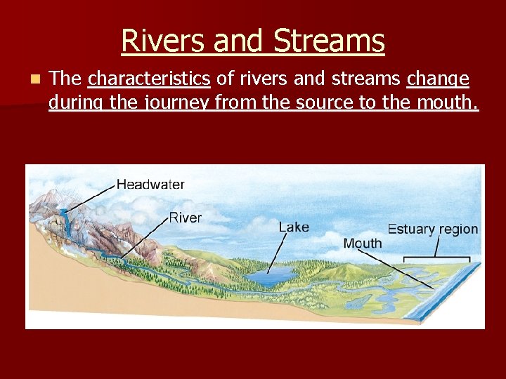 Rivers and Streams n The characteristics of rivers and streams change during the journey from the source to the mouth.