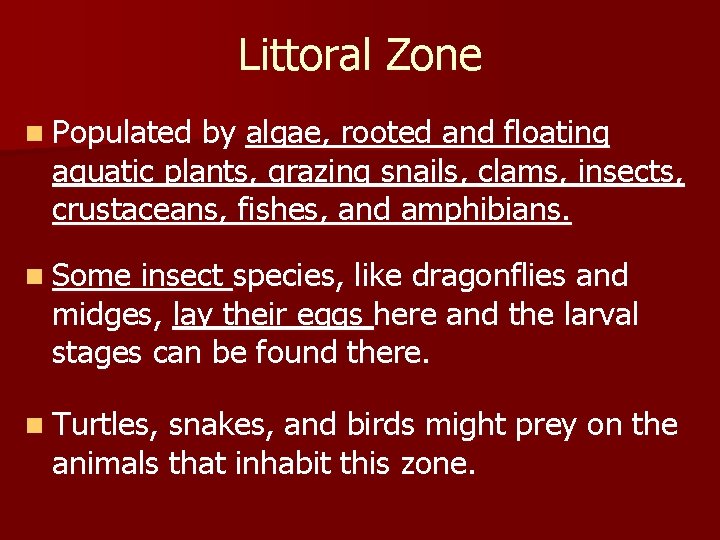 Littoral Zone n Populated by algae, rooted and floating aquatic plants, grazing snails, clams, insects, crustaceans, fishes, and amphibians. n Some insect species, like dragonflies and midges, lay their eggs here and the larval stages can be found there. n Turtles, snakes, and birds might prey on the animals that inhabit this zone.