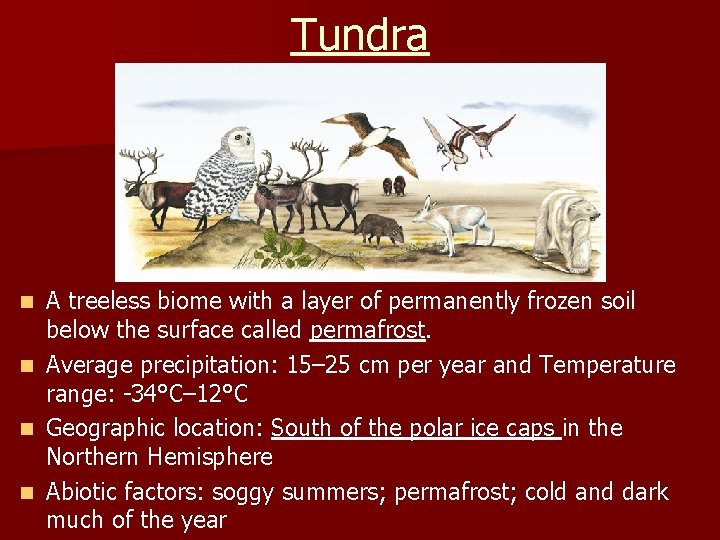 Tundra A treeless biome with a layer of permanently frozen soil below the surface called permafrost. n Average precipitation: 15– 25 cm per year and Temperature range: -34°C– 12°C n Geographic location: South of the polar ice caps in the Northern Hemisphere n Abiotic factors: soggy summers; permafrost; cold and dark much of the year n