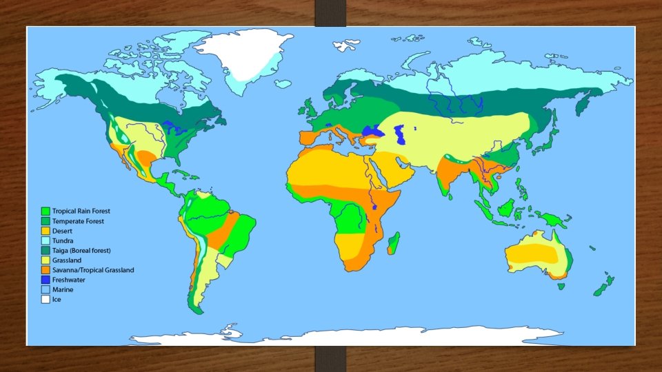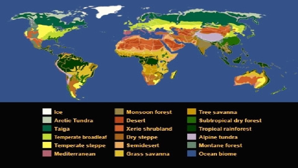 There are 8 distinct Biomes • • DESERT GRASSLAND SAVANNA CHAPPARAL RAIN FOREST TEMPERATE FOREST CONIFEROUS FOREST (TAIGA) TUNDRA