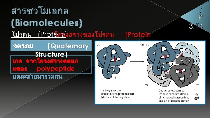 สารชวโมเลกล (Biomolecules) โปรตน (Protein( โครงสรางของโปรตน Structure) จตรภม (Quaternary Structure) มกเจอใน 2 รปแบบดงน Globular Protein เชน Hemoglobin Fibrous Protein เชน Collagen (Protein P 3. 15