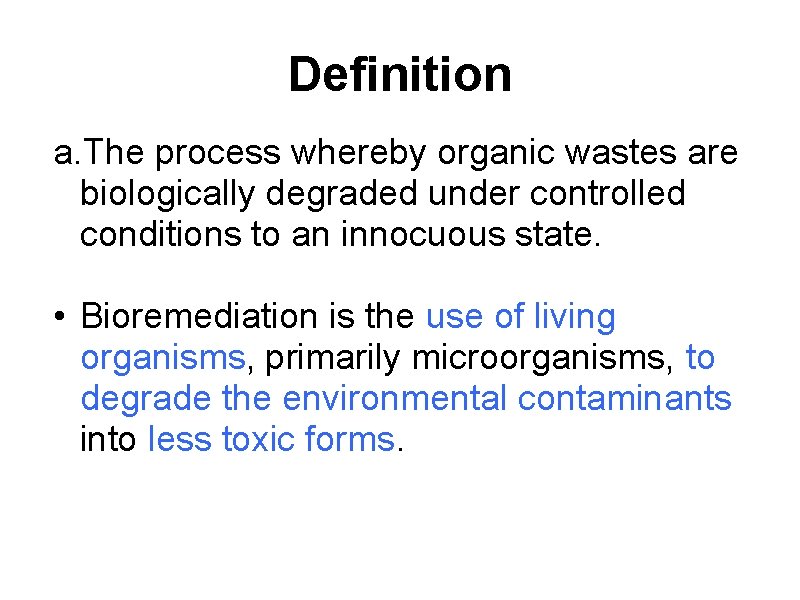 Definition a. The process whereby organic wastes are biologically degraded under controlled conditions to an innocuous state. • Bioremediation is the use of living organisms, primarily microorganisms, to degrade the environmental contaminants into less toxic forms.