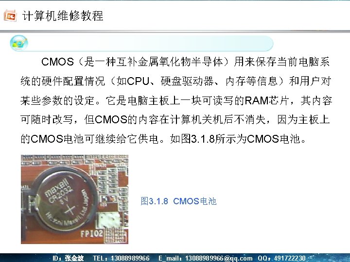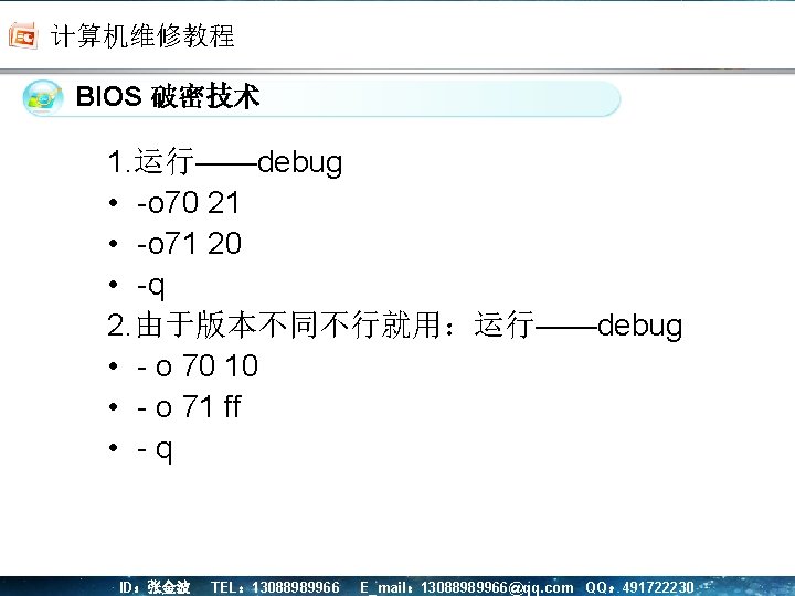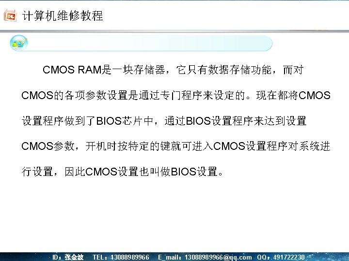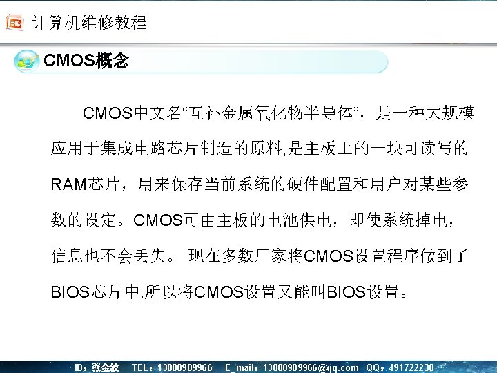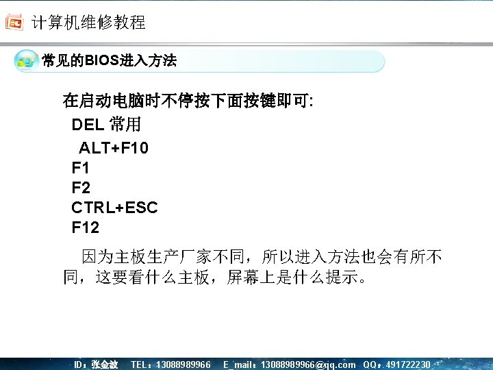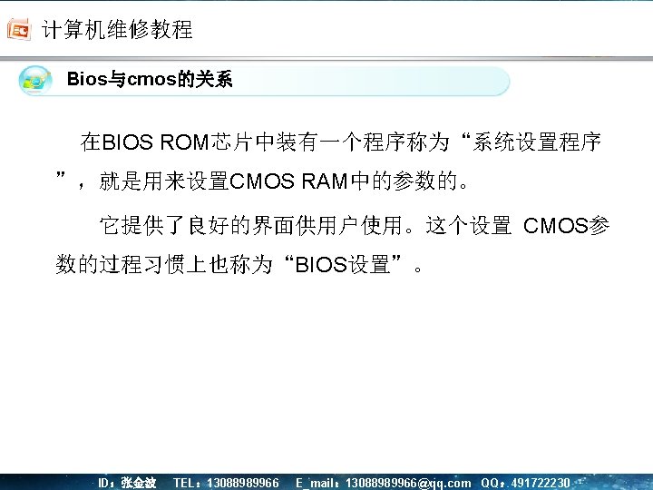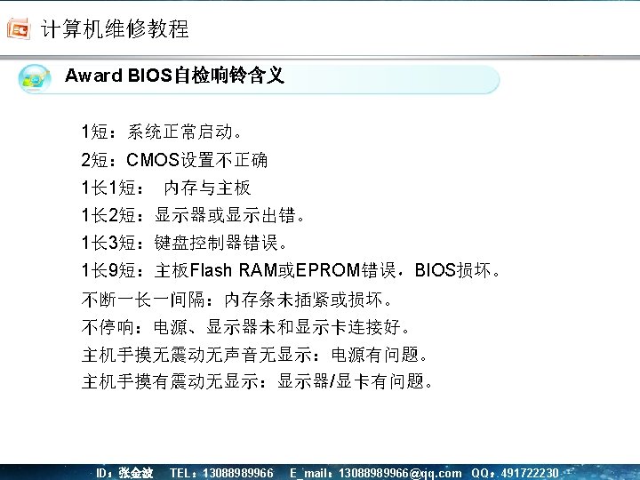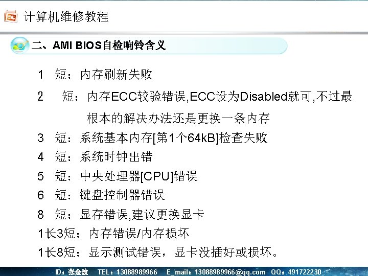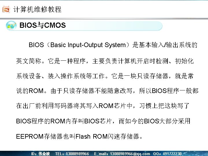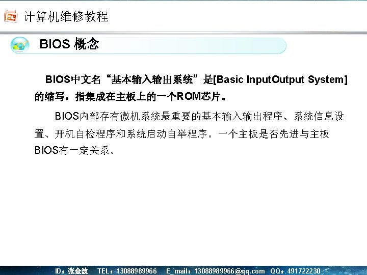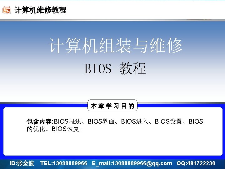 计算机维修教程 单击此处编辑母版标题样式 常见的BIOS芯片类型 1. AMI BIOS 2. Award BIOS 3. Phoenix BIOS ID:张金波 TEL: 13088989966 E_mail: 13088989966@qq. com QQ: 491722230