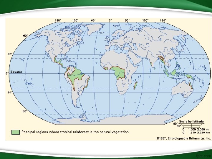 Tropical Rain Forest • Low latitudes • Tropical climate, warm year round • 2 seasons: wet & dry • Contain the most biodiversity, many unique species • Threated by deforestation • Brazil, Peru, Dem. Rep. of Congo, Indonesia, Thailand
