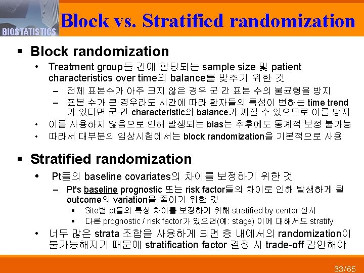 Implementation - Timing BIOSTATISTICS § Actual randomization § Should be delayed until just prior to therapy initiation § Example • Alprenolol Trial, Ahlmark, et al. (1976) – – Nonblinded trial for AMI 393 patients randomized at the time of admission Alprenolol treatment was not initiated until 2 weeks later 231 excluded due to MI not documented, dead, contraindications to therapy, etc. – Only 162 patients treated, 69 alprenolol & 93 placebo – Imbalance raises concerns about comparability and/or possible bias for exclusion § Delaying randomization until initiation § Pt’s withdrawal로 인한 문제를 partly 해결해 줌 32/65