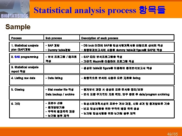 BIOSTATISTICS Data Management process 항목들 Sample Process Sub process Description of each process 7. Data validation § Run edit check § DCF generation § DB correction § Edit check을 수행하여 query생성 후 연구자에게 송부 8. Medical coding § Coding for AE/Medication § Review of coded data by reviewer § DMP에 정의한 dictionary(AE; Med. DRA, Medication; KIMS) 이용, medical coding § Coding 완료된 자료: medical reviewer(MD/Pharmacist)에 검토요청 후 수 정사항 반영 9. DB quality check § DB QC 수행 § DMP에 정의한 변수에 대해 일정 비율의 피험자 자료 출력, CRF와 비교 § DBQC report작성 § 오류사항과 오류율을 정리한 DBQC report 작성 (edit check) § DBQC결과 오류율 미만일 경우 DB lock 10. DB lock 11. Blinded meeting § 수정된 query를 DB에 반영 § Violation list 작성 § Protocol 정의된 violation/deviation 사항에 해당되는 피험자 listing § Blinded meeting 을 통해 피험자별 분석 집단 결정 12. Data transfer 13. Closing § DB transformation /test § DMP에 정의된 절차 사용, 통계분석에 적합한 형태로 구조변경, 무결성 검증 § DB transfer § 통계분석 담당자에게 보안을 유지하며 data 전달 § DM master file작성 § DB backup / archive § DM과정 시 생성된 모든 문서를 정리/보관 § DM과정 동안 주기적인 자료 백업 및 업무 종료 후 DB archive 47/65