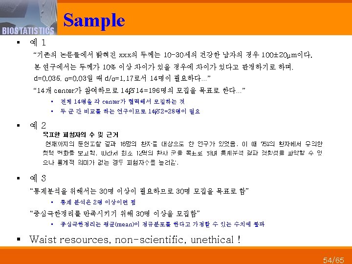 BIOSTATISTICS u v 임상시험 시작 시 적정 피험자 수 산출 적절하게 계획되고 수행된 clinical trial • v Why should we calculate the sample size? Intervention의 effectiveness를 평가할 수 있는 powerful experimental technique 임상시험은 군 간 차이를 detect할 수 있는, 충분한 크기의 statistical “power”가 확보되어야 • Under-powered trial은 이후 다시 시도되지 않을 것 • Sample size 계산은 planning의 essential part v Sample size 계산을 위해서는 해당 study의 shape이 결정되어야 v Sometimes, sample size calculation is all we have to do to plan the study 52/65