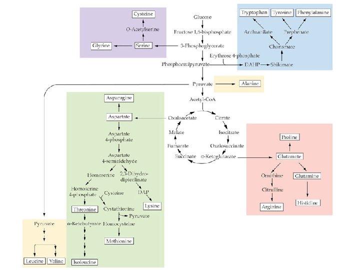 Overview of Amino Acid Biosynthesis • The carbon skeletons of all twenty amino acids are derived from just seven metabolic intermediates, that together, are found in three metabolic pathways. These include: – Three glycolytic pathway intermediates • 3 -phosphoglycerate • 3 -phosphoenolpyruvate • puruvate
