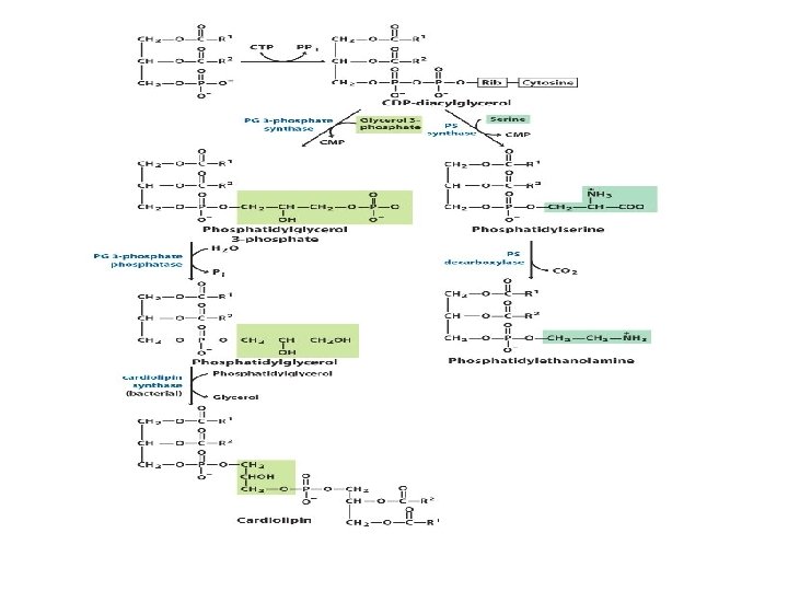Biosynthesis in Eukaryotes of Anionic Glycerophospholipids Strategy 1 (CDP-DAG) • phosphatidylglycerol (PG) by glycerol 3 -phosphate replacing CMP, then phosphatase • cardiolipin by PG replacing CMP on CDP-DAG [CDP-DAG instead of PG] • phosphatidylinositol (PI) by inositol replacing CMP • phosphorylation of PI at positions 4 and 5