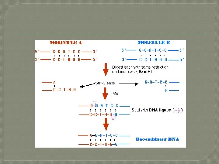 DNA Ligase �sticky ends form H-bonds with sticky ends of C’ bases from other DNA: temporary bonds �DNA ligase make bonds permanent: makes covalent bonds in sugar-phosphate backbone