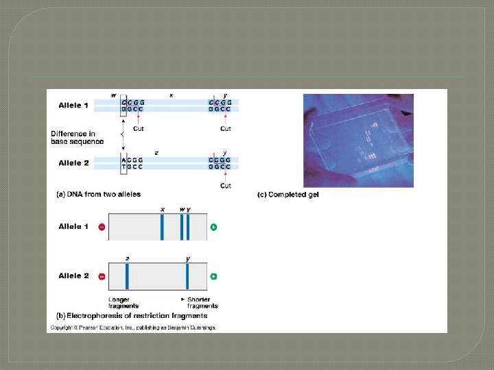 Restriction Fragment Analysis �fragments produced be restriction enzymes put thru gel electrophoresis band pattern characteristic of starting molecule & restriction enzyme used �able to identify viruses & plasmids by their band patterns �then recover DNA from gels � 1 way of getting pure samples of DNA – won’t work with DNA from eukaryotic cells: gel electrophoresis smear not bands