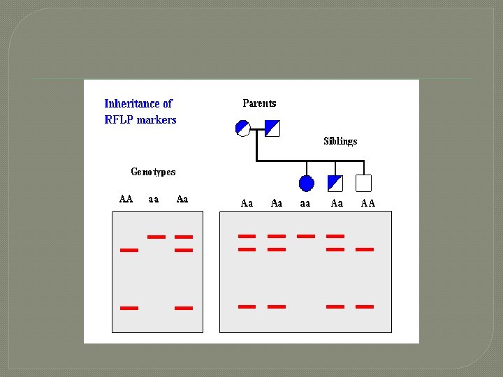 RFLP �Restriction Fragment Length Polymorphism: single nucleotide polymorphism (SNP) that exists in the restriction site for a particular enzyme, making the site unrecognizable by that enzyme & changing lengths of the restriction fragments formed by digestion with that enzyme �found in coding & noncoding DNA