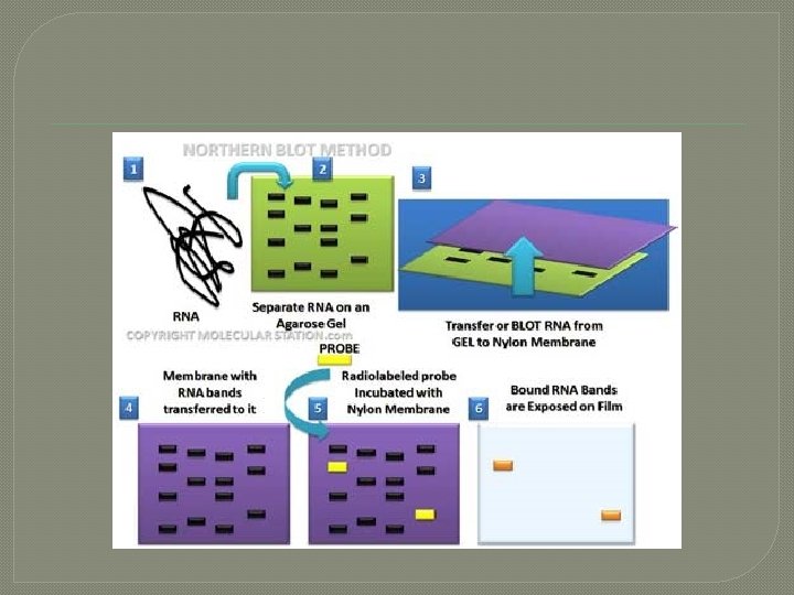 Northern Blotting �in vitro hybridization with labeled probes looking for specific m. RNAs �could be used to look at how expression of a gene changes during the embryonic development of organism �carry out gel electrophoresis on m. RNA
