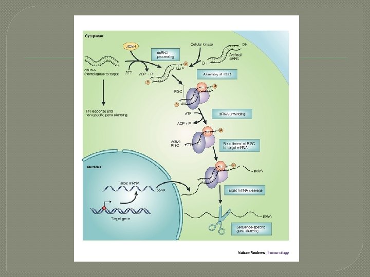 RNAi �RNA interference �method for silencing expression of selected genes �uses synthetic ds. RNA molecules matching the sequence of gene to trigger breakdown of the gene’s m. RNA or to block its translation