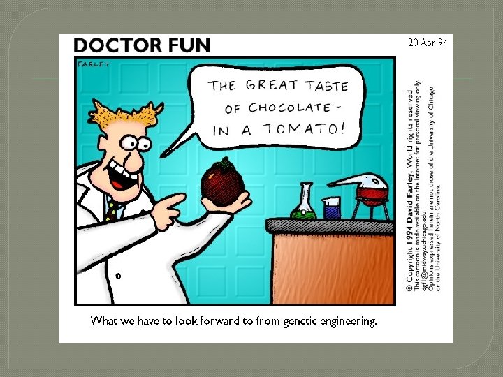 Transgenic Organisms �gene for desired protein inserted into bacterial genome and become tiny “factory” for making protein • Insulin • Digestive enzymes • Growth Hormone