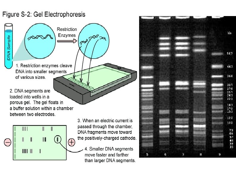 Molecular Tools PCR: Process of quickly replicating a few DNA sequences into thousands Restriction Enzymes: Cut DNA into fragments so that pieces can be rearranged, added, or taken out. Electrophoresis: The process of running DNA fragments through a gel to separate them based on their size. DNA Fingerprinting: Matching the separation pattern of one DNA sample to other samples Paternity tests, forensic crime analysis, etc.