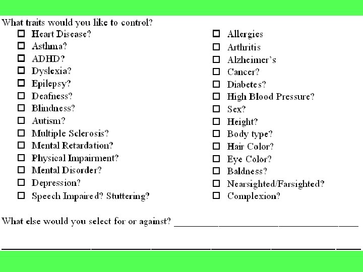 DESIGN YOUR OWN BABY ¡ ¡ On the next slide select traits you would like the geneticist to eliminate from your egg and sperm. Checking the box ensures your child will not receive these traits or that you can control them