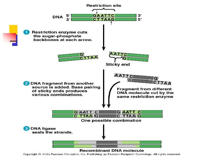 Restriction Enzymes usually make many cuts in a DNA molecule n Yields a set of restriction fragments n Most useful restriction enzymes cut DNA in a staggered way n n n Produce fragments with “sticky ends” Can bond with complementary “sticky ends” of ANY other DNA fragment DNA ligase (“molecular glue”) n enzyme that seals the bonds between restriction fragments