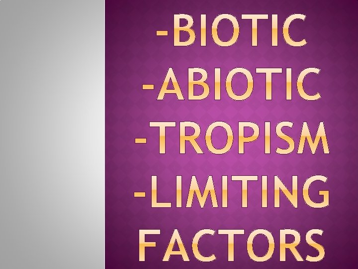 Biotic Abiotic Biomes Limiting Factors Ecosystem Niche Predator Prey Parasite Host Tropism Phototropism Geotropism Thermotropism Hydrotropism Thigmotropism Have you heard or seen any of these words? Can you figure out what some might mean from their prefixes or suffixes? Take a minute and talk to you neighbor.