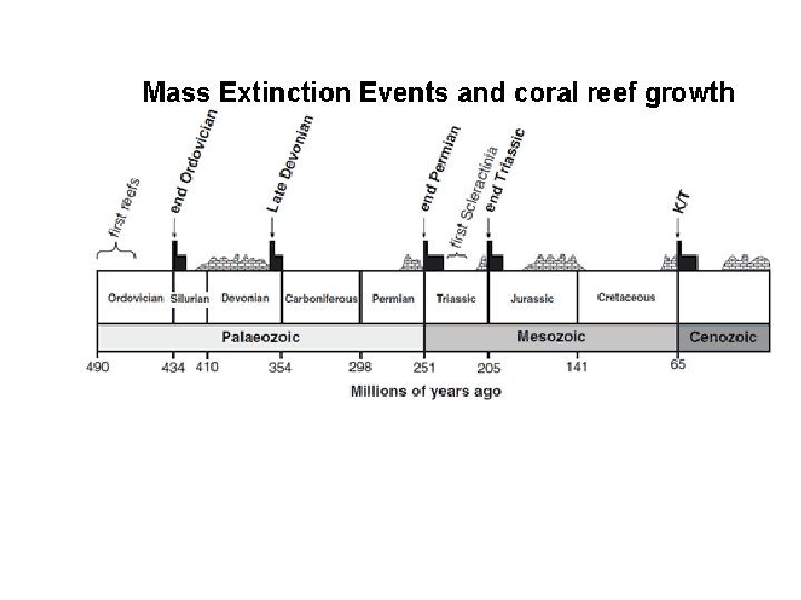 Příčiny: - snížení obsahu atmosferického CO 2, - zalednění (Gondwana, pohyb k J pólu, ochlazení, 5 pulsů glaciálů, - regrese (voda vázaná v ledu, vyschnutí vnitrokontinentálních pánví ) posun chladnomilné fauny k rovníku, zánik tropické fauny, anoxie (černé břidlice) decimace mělkov. společenstev - transgrese - opačný postup V Jordánsku (Batra Formation) pozorována anoxie způsobená odtokem vod ze saharských oblastí po skončení zalednění = > fotická zóna (šelf) měla euxinické podmínky pro život (Abbot et al. 2007) Výkladové hypotézy: 1) Silná takonská fáze vrásnění – výzdvih Apalačí, vulkanismus, ten během hirnantu mizí – silné zvětrávání a prudké snížení CO 2, to koresponduje s krátkým a rychlým nástupem zalednění 2) Výbuch supernovy v blízkosti mléčné dráhy – vzrůst gama záření – zvýšená radiace – decimace ozonové vrstvy Toto vymírání – čistě terestrické (klimatické) příčiny, žádný impakt, žádný (? ) zvýšený globální vulkanismus, období -+ rozptýlených kontinentů, orogeneze jen v Apalačích, přesto je druhé největší (relativně k tehdejšímu životu) ze všech pěti HV Revitalizace ve spodním siluru poměrně rychlá, nástup diverzifikace útesových společenstev pokračující ještě v devonu (četné útesové vápence)