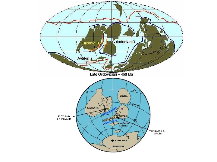 Svrchní ordovik - paleogeografie -S. Amerika(A) na rovníku -Gondwana (G) okolo J. pólu (zalednění, vazba vody) S -Baltika(b)-Sibiř(S) odděleny - kaledonská orogeneze = Takonské p. + Skandinávie - výraznější klimatická zonálnost A B G