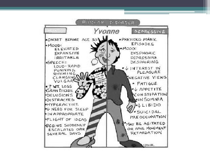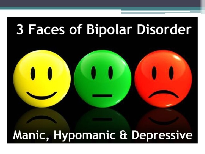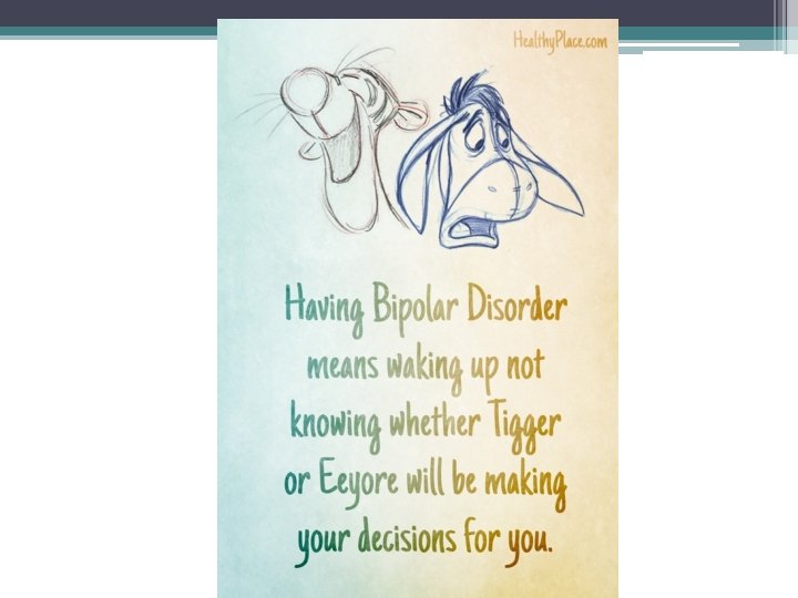 Diagnosis • People with bipolar disorder are also at higher risk for thyroid disease, migraine headaches, heart disease, diabetes, obesity, and other physical illnesses. • These illnesses may cause symptoms of mania or depression. • They may also result from treatment for bipolar disorder.
