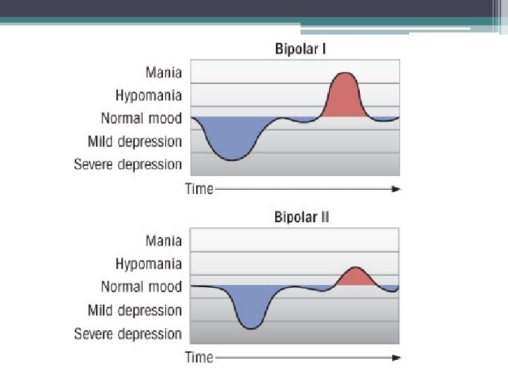 Diagnosis • People with bipolar disorder are more likely to seek help when they are depressed than when experiencing mania or hypomania • Therefore, a careful medical history is needed to assure that bipolar disorder is not mistakenly diagnosed as major depression • Unlike people with bipolar disorder, people who have depression only (also called unipolar depression) do not experience mania