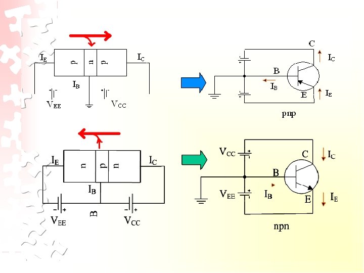 Transistor currents -The arrow is always drawn on the emitter -The arrow always point toward the n-type IC=the collector current IB= the base current IE= the emitter current -The arrow indicates the direction of the emitter current: pnp: E B npn: B E