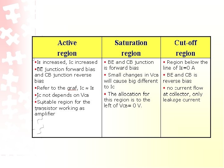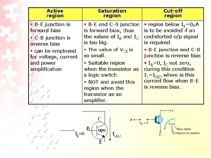 Output characteristics for a common-emitter npn transistor • For small VCE (VCE < VCESAT, IC increase linearly with increasing of VCE • VCE > VCESAT IC not totally depends on VCE constant IC • IB(u. A) is very small compare to IC (m. A). Small increase in IB cause big increase in IC • IB=0 A ICEO occur. • Noticing the value when IC=0 A. There is still some value of current flows.