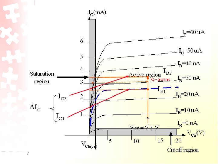 Example From output characteristics of common emitter configuration, find ac and dc with an Operating point at IB=25 A and VCE =7. 5 V.