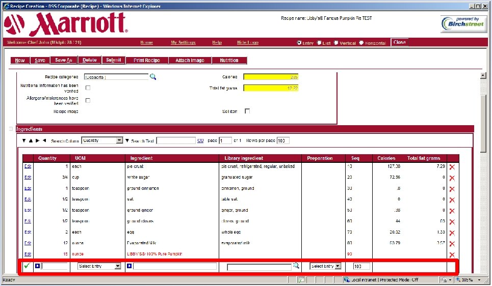 Before finishing up the The system can now recipe, review the rest of calculate the Calories your ingredients