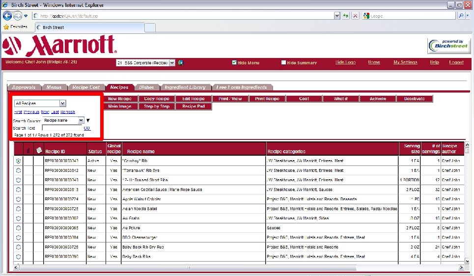 The Recipe Tabs… Recipes: Search, View, Edit, Print and Create Recipes. Find Global and Property Level Recipes. Copy Recipes. (needed for this pilot)