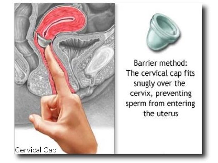 The Cervical Cap • Cervical caps are soft rubber cups with a round rim that fits snugly around the cervix. It is smaller than a diaphragm and uses suction to stay in place. The cap must be fitted by a health care professional before it can be prescribed for you (not every time you use it) and used with a spermicide. The cervical cap prevents sperm from entering the uterus. It is inserted into the vagina, anytime before intercourse.