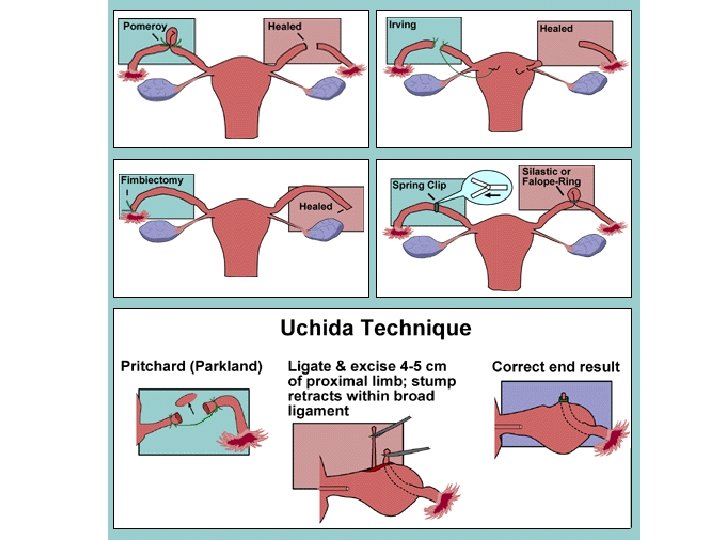 Female Surgical Sterilization • A tubal ligation is a surgical operation performed to make a woman sexually sterile. There are two common methods of tubal ligation; minilaparotomy and laparoscopy. A minilaparotomy involves making a small incision in the abdomen and locating the fallopian tubes, which conduct the eggs from the ovaries to the uterus. After the tubes are found and drawn outside the body through the incision, a portion of each tube is removed and the ends are tied.
