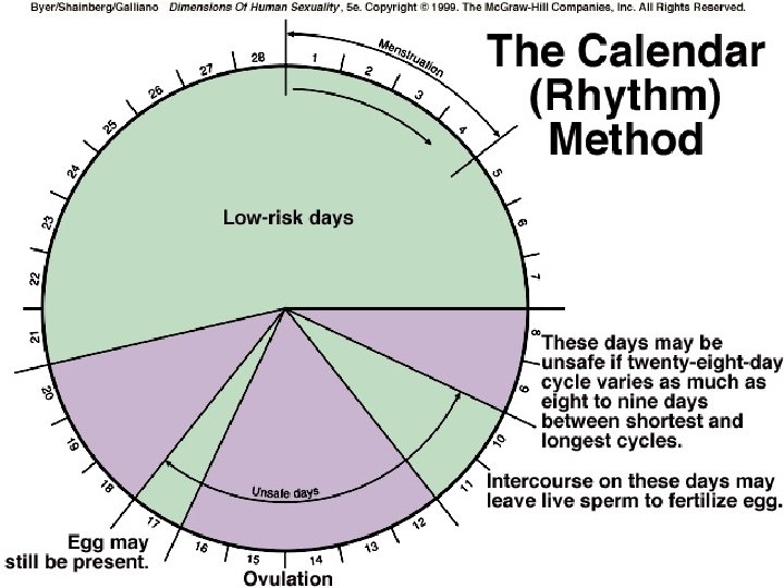 Natural Family planning • Also known as the rhythm method • Rhythm is a great way to increase the chances of achieving a pregnancy, but not as reliable at deceasing the chances of preventing a pregnancy • The theory is to time intercourse around when the female is not fertile. • Based on mucus readings, and basal body temperatures