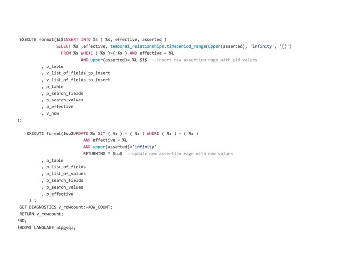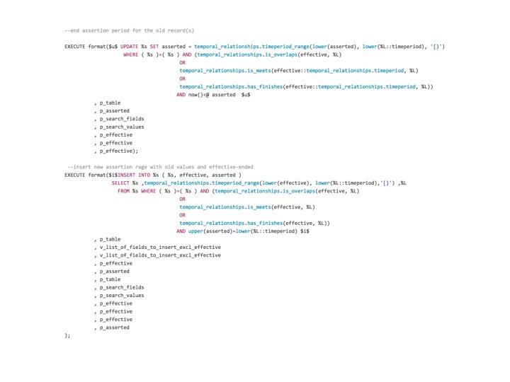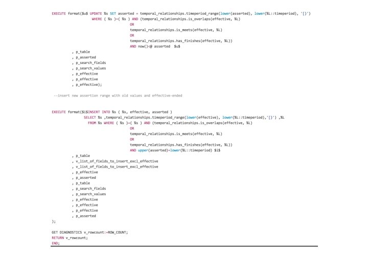 Define PK We define a bitemporal primary key when we create a bitemporal table, i. e. there can’t be a temporal table without a bitemporal PK: , CONSTRAINT postgres_cluster_id_asserted_effective_excl EXCLUDE USING gist (postgres_cluster_id WITH =, asserted WITH &&, effective WITH &&)) In addition we define a corresponding check constraint: , CONSTRAINT "bitemporal pk postgres_cluster_id" check(true or 'pk' <> '@postgres_cluster_id@') Function: select bitemporal_internal. pk_constraint('postgres_cluster_id');