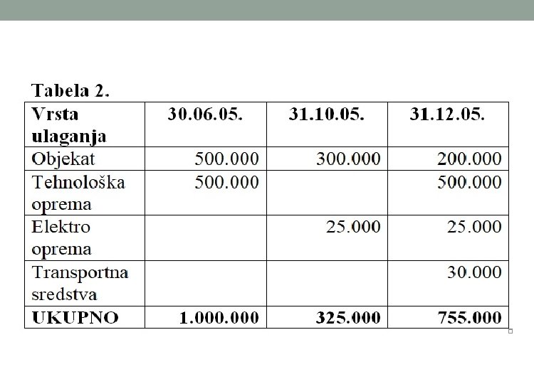 Prethodna tabela je osnov za izradu dinamike stvarnih ulaganja, koja je prikazana u sledećoj tabeli.