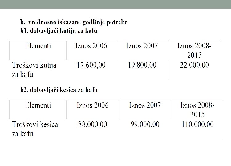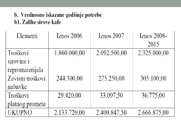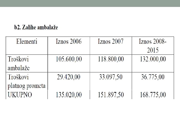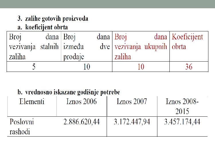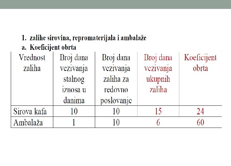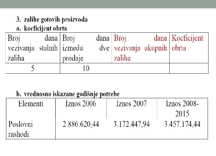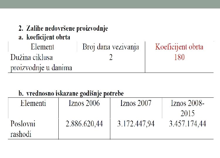 o Vrednosno iskazivanje godišnje potrebe zaliha sirovina, repromaterijala i ambalaže se računa po nabavnoj vrednosti. o Nabavnu vrednost čine svi troškovi koji prethode skladištenju zaliha. Ulazni podaci se preuzimaju iz bilansa uspeha, a deo potrebnih podataka se saznaje iz marketing plana (plan nabavke). o Vrednosno iskazane godišnje potrebe zaliha sirovina, repromaterijala i ambalaže = Svi godišnji direktni troškovi vezani za nabavku o Broj dana vezivanja zaliha u nedovršenoj proizvodnji zavisi od dužine ciklusa proizvodnje, odnosno od vremenskog perioda koji protekne od ulaska prve količine inputa u proces proizvodnje pa sve do izlaska gotovog proizvoda iz procesa proizvodnje.