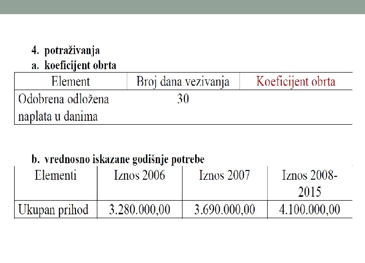 o Broj dana vezivanja zaliha nedovršene proizvodnje = Dani trajanja ciklusa proizvodnje o Vrednosno iskazane godišnje potrebe zaliha nedovršene proizvodnje = Ukupni godišnji troškovi – Troškovi finansiranja iz spoljnih izvora o Broj dana vezivanja zaliha gotovih proizvoda = Stalne zalihe + (Broj dana između dve prodaje / 2) o Vrednosno iskazane godišnje potrebe zaliha gotovih proizvoda = Ukupni godišnji troškovi – Troškovi finansiranja iz spoljnih izvora o Obrtna sredstva vezana u potraživanjima su sredstva kojim preduzeće kreditira svoje kupce. o Broj dana vezivanja potraživanja = Prosečan broj dana odloženog plaćanja koji se odobrava kupcima o Vrednosno iskazana godišnja potraživanja = Ukupni godišnji prihod