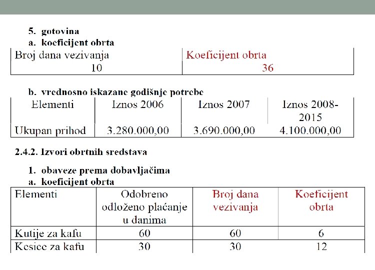 Izračunavanje vrednosti trajnih obrtnih sredstava o Svaki pojedinačni deo poslovanjem uslovljenih obrtnih sredstava i izvora obrtnih sredstava izračunava se po obrascu: Vrednosno iskazane godišnje potrebe / Koeficijent obrta = 360 / Broj dana vezivanja - Broj dana vezivanja je prosečno vreme vezivanja za proces reprodukcije pojedinih delova poslovanjem uslovljenih obrtnih sredstava i izvora obrtnih sredstava.