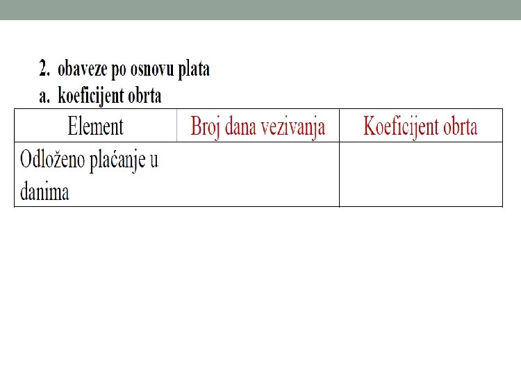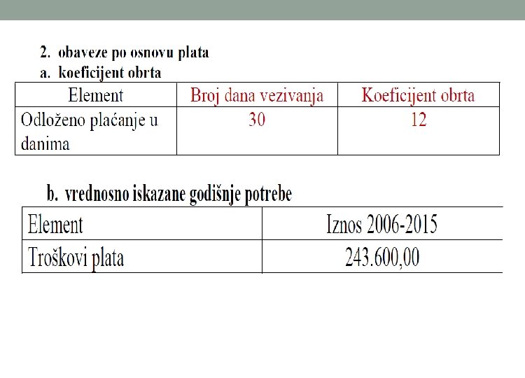o U poslovnim planovima izvori obrtnih sredstava nastaju po osnovu obaveza prema dobavljačima i po osnovu obaveza za plate. o Broj dana vezivanja obaveza prema dobavljačima uslovljen je politikom odložene naplate dobavljača i ovaj podatak se preuzima iz plana nabavke. o Broj dana vezivanja obaveza prema dobavljačima = Prosečan broj dana odloženog plaćanja koji odobravaju dobavljači o Vrednosno iskazane godišnje obaveze prema dobavljačima = Ukupni godišnji troškovi inputa koji se odloženo plaćaju o Izvori obrtnih sredstava po osnovu obaveza za plate postoje zato što se plate isplaćuju jednom mesečno za rad obavljen u prethodnom mesecu. o Broj dana vezivanja po osnovu plata = 30 o Vrednosno iskazane godišnje obaveze za plate = Ukupni godišnji trošak plata