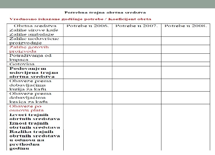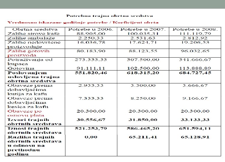Trajna obrtna sredstva o Predstavljaju razliku između poslovanjem uslovljenih obrtnih sredstava i izvora obrtnih sredstava. o Poslovanjem uslovljena obrtna sredstva su prosečna obrtna sredstva koja su tokom veka trajanja projekta vezana u preduzeću i sastoje se iz: Prosečnog nivoa zaliha, Prosečnog nivoa potraživanja od kupaca i Vezane gotovine. o Izvori obrtnih sredstava predstavljaju prosečni deo obaveza koje preduzeće tokom godina odloženo plaća i na taj način umanjuje iznos potrebnih obrtnih sredstava, a sastoje se iz: Prosečnog nivoa obaveza prema dobavljačima, Prosečnog nivoa obaveza po osnovu plata.