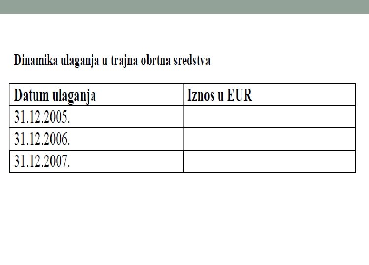 1. Investiciona ulaganja o. Ulaganja u stalnu imovinu, o Ulaganja u trajna obrtna sredstva • Ulaganja u stalnu imovinu obuhvataju sva ulaganja u nematerijalnu imovinu i osnovna sredstva, koja će tokom dužeg vremenskog perioda biti na raspolaganju preduzeću i čiji se efekti očekuju u vremenskom periodu dužem od jedne godine. • Pod ulaganjem u trajna obrtna sredstva podrazumeva se vezivanje sredstava u dužem periodu od jedne godine i ova ulaganja predstavljaju razliku između poslovanjem uslovljenih obrtnih sredstava (zalihe, potraživanja, gotovina) i izvora obrtnih sredstava (obaveze). Ova ulaganja su vrednosno vezana u preduzeću.