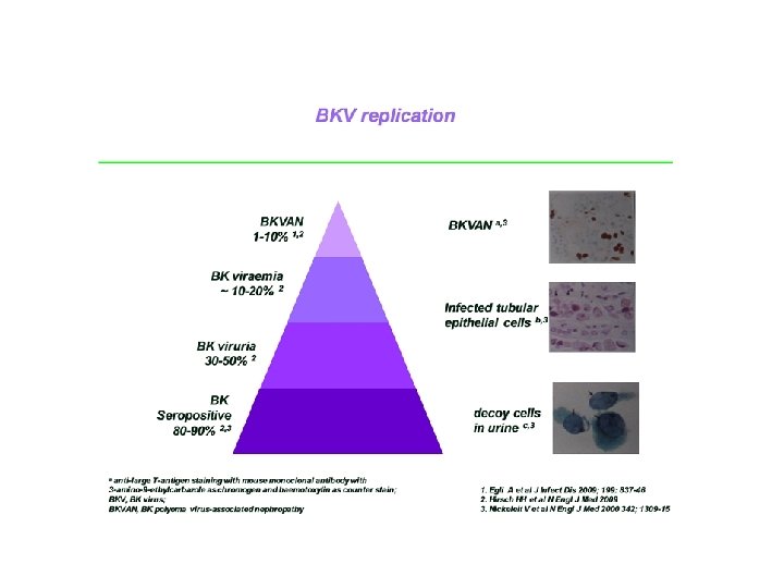 What are the risk factors for BKV replication? Non-modifiable risk factors • • • years)1 older recipients (>65 recipient gender: male 1 advanced donor age (>65 years)1 HLA mismatch 2, 3 acute rejection 2, 3 donor BKV seropositive/recipient BKV seronegative 4 recipient ethnic origin: africanamerican 2 re-transplantation 4 paedriatic recipient 1 Cs. A, cyclosporine; A, Cs. A, cyclosporine; HLA, human leukocyte antigen MMF; mycophenolate mofetil; BKVAN: BK polyoma virus-associated nephropathy • nephropathy Modifiable risk factors Immunosuppressant 2 - CNIs: tacrolimus based vs. Cs. A based Induction: thymoglobulin vs. IL 2 vs. none steroids 3 Anti-metabolites: MMF based vs. azathioprine based vs none stents 5 1. Schold JD et al Transpl Int 2009; 22: 626 -34 2. Dharnidharka VR et al Transplantation 2009; 87: 1019 -26 3. Hirsch HH et al N Engl J M 2009; 86 -96 4. Bohl DL, Brennan DC. Clin J Am Soc Nephrol 2007; 2(Suppl 1): S 3646 5. Brennan DC et al Am J Translant 2005; 5: 582 -94