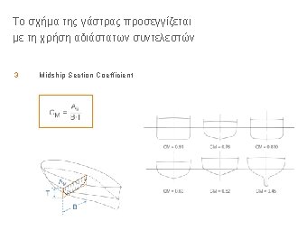 Ένα παράδειγμα: USS Oliver Hazard Perry (FFG-7) Class Frigate Hull form characteristics: LOA = 453 ft LPP = 408 ft T= 14, 35 ft B= 45, 17 ft CP = 0, 594 CM = 0, 745 Displ = 3345 LT SW (at section of maximum area) (bare hull to DWL)