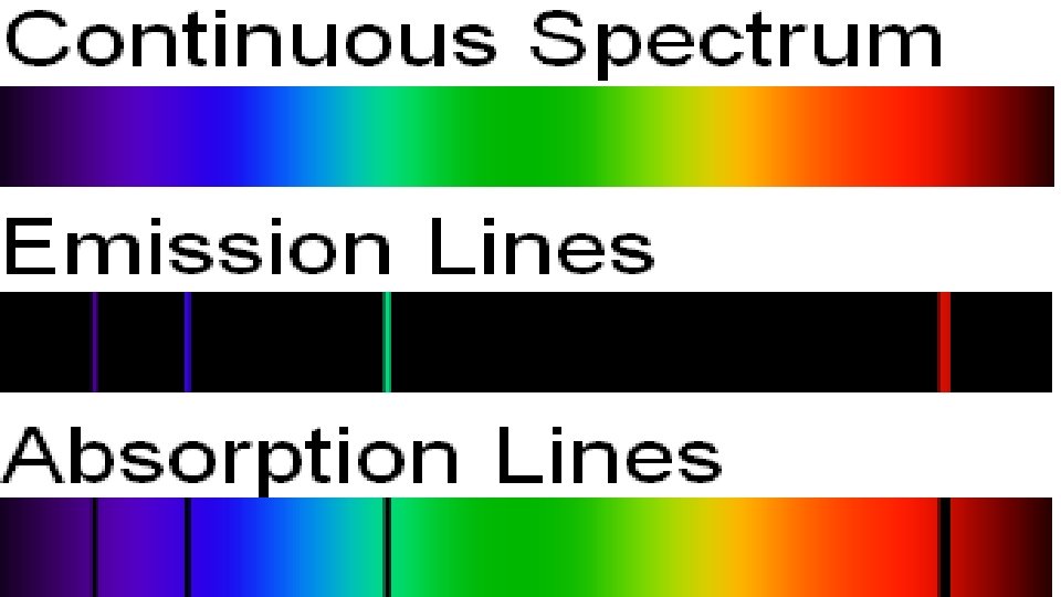 Spectra • Using a diffraction grating will break white light up into spectra. The spectra are made by photons with a particular wavelength (color) • There are three types of spectra • Emission – only see bands of color, made by an excited gas (translucent) • Continuous – see all colors, made by an opaque object • Absorption – see all colors with black lines corresponding to absorption, where a gas is absorbing those photons which make those black lines