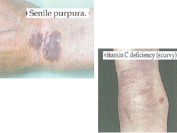 2 - Acquired vascular defect: Simple easy bruising is common in healthy women especially of childbearing age. Senile purpra due to atrophy of supporting tissues of cutaneous blood vessels. Purpura associated with infections: many bacteria, viral or rickettsial infections may cause purpura from vascular damage by microorganism or as a result of immune complex formation.