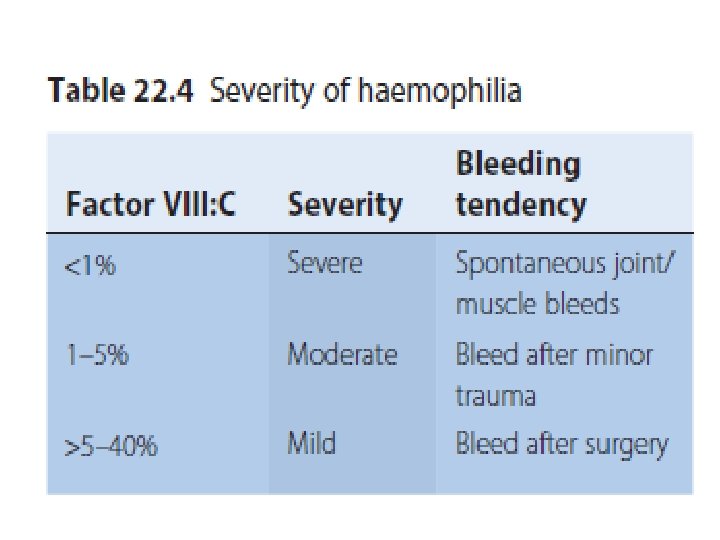 Management Recombinant FVIII concentrate for haemophilia A recombinant FIX concentrate for haemophilia B. given by prompt intravenous infusion whenever there is any bleeding. Raise to 30% minor bleeds and simple joint bleeds. Raise to 100% Major surgery or life-threatening bleeds then maintained at 30– 50% for up to 2 weeks to prevent secondary haemorrhage. regular infusion usually 8– 12 -hourly for FVIII, 12– 24 -hourly for FIX, or by continuous infusion) and by closely monitoring plasma levels. Avoid Intramuscular injections, aspirin and non-steroidal anti-inflammatory drugs should be avoided in all patients with haemophilia.