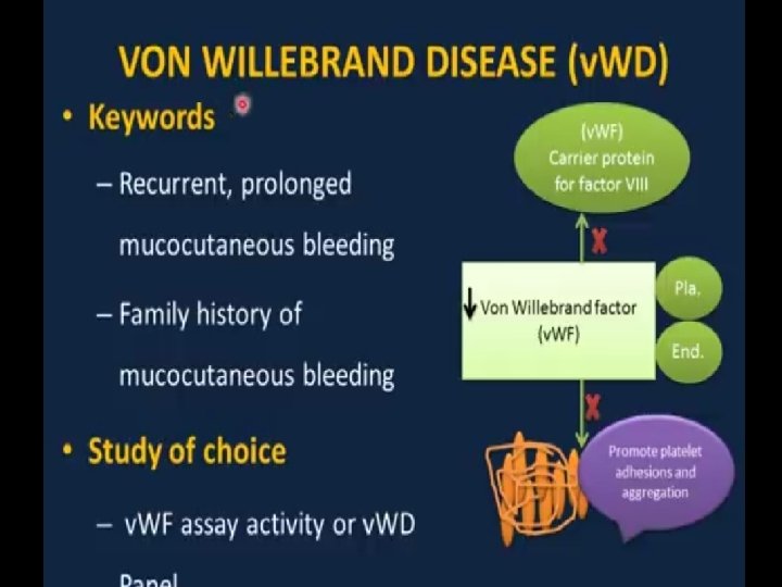 von Willebrand disease ▪ Family of bleeding disorders caused by an abnormality of the von Willebrand factor (v. WF), carrier protein for Factor VIII � can range from almost undetectable to severe bleeding propensity ▪ v. WF binds on platelets to its specific receptor glycoprotein Ib and acts as an adhesive bridge between the platelets and damaged subendothelium at the site of vascular injury � i. e. causes platelets to stick ▪ v. WF also protects FVIII from degradation